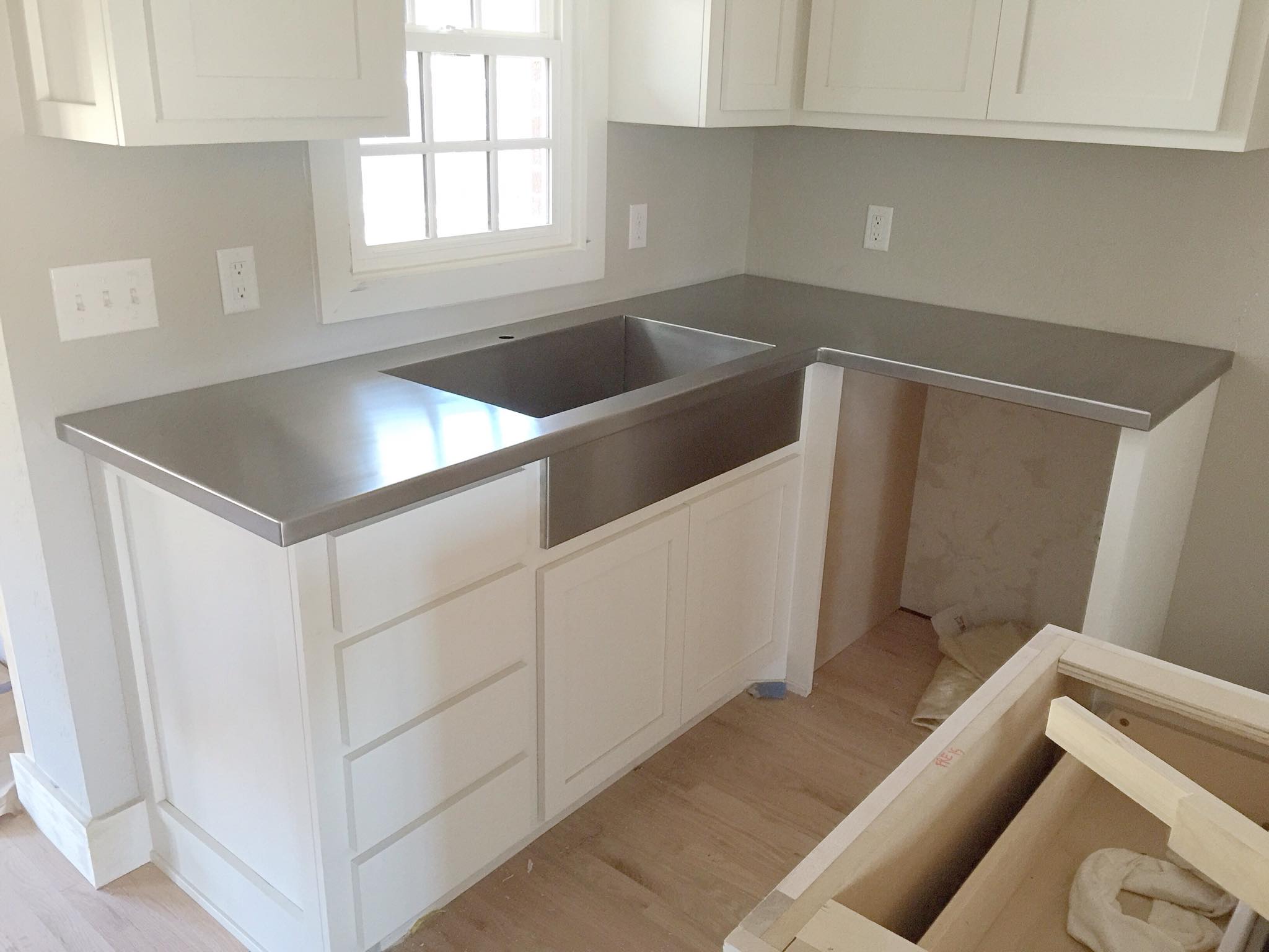 Stainless steel farm style sink with counter top.